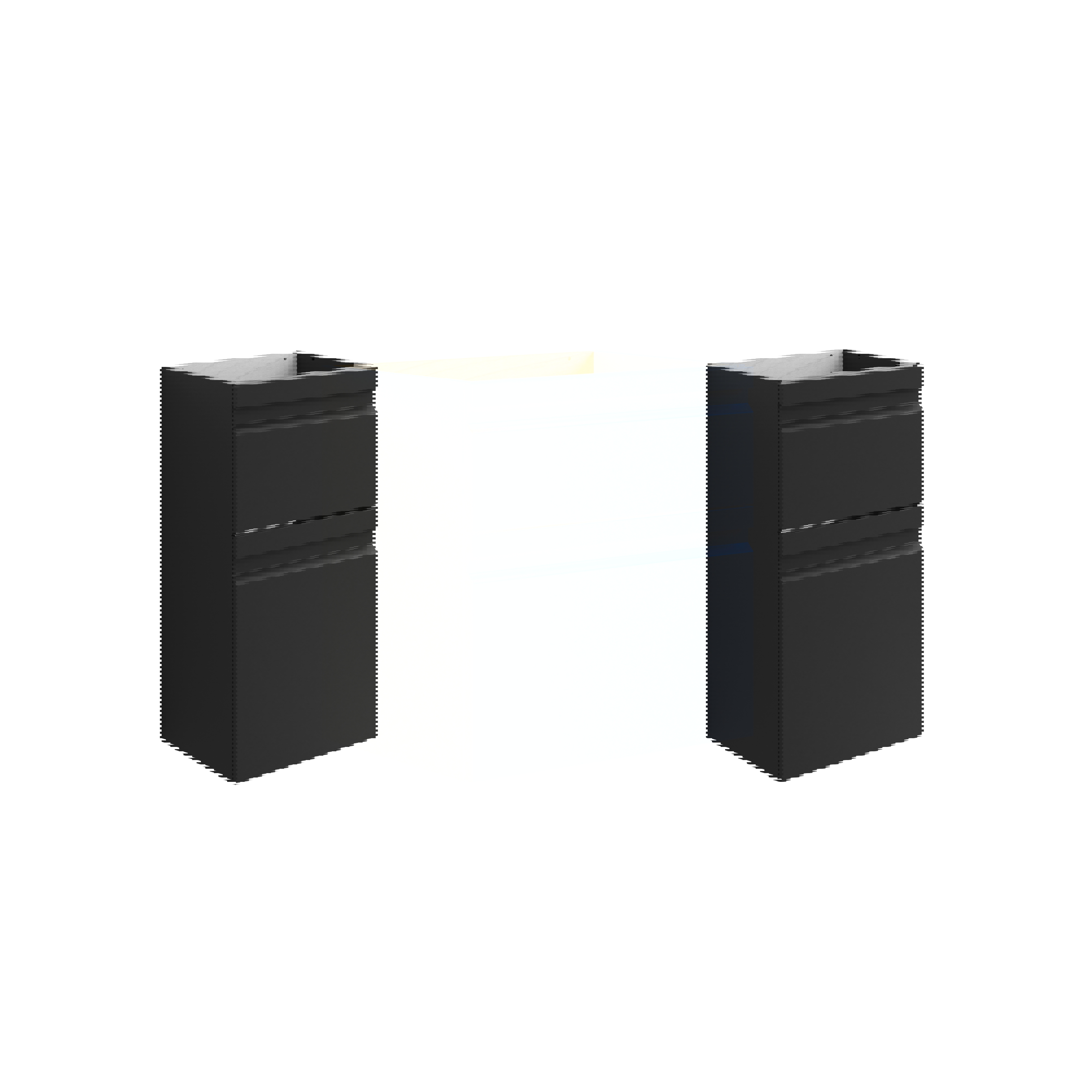 Sie können die Unterschränke auch als separates Möbelstück in Ihrem Bad verwenden. An einer Wand haben Sie Ihren Waschtischunterschrank mit einem schönen Waschbecken, und an der Wand daneben stellen Sie 2 Unterschränke ohne Waschbecken, dafür aber mit einer schönen, farblich abgestimmten Tischplatte zusammen. Auf diese Weise erhalten Sie viel zusätzlichen Stauraum in einer angenehmen Höhe.