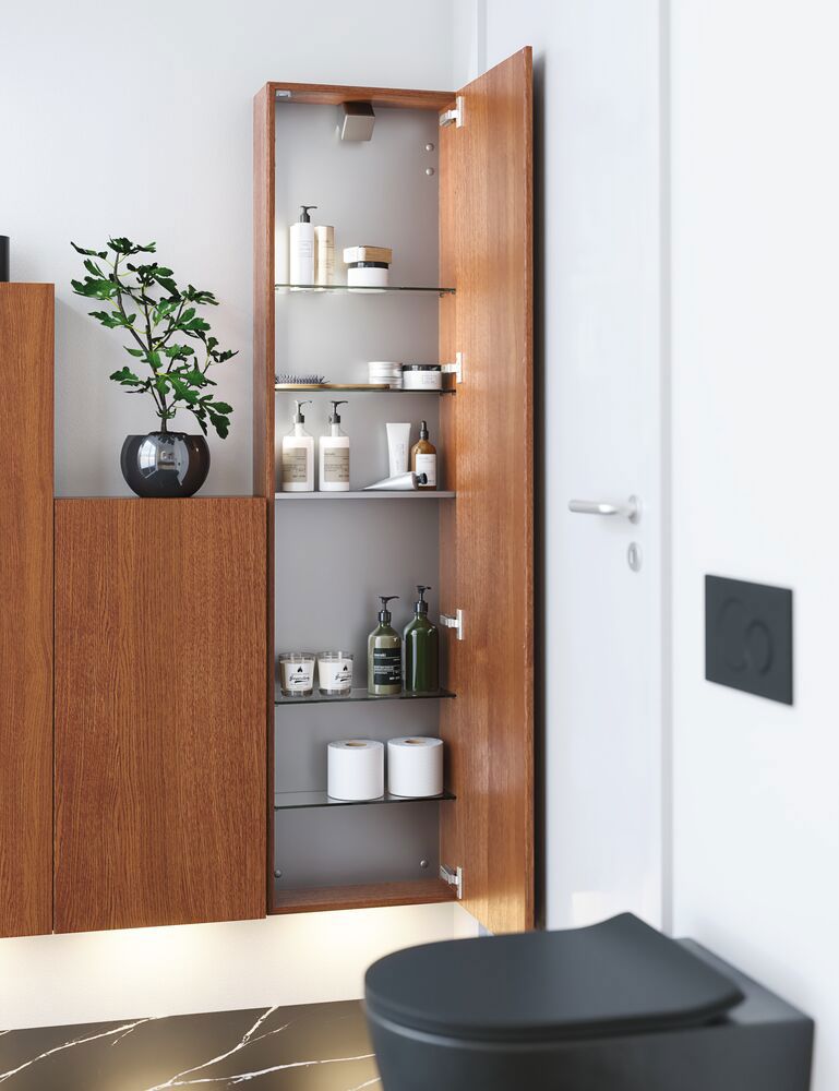 Um den vollen Überblick über Ihre Gegenstände in den Oberschränken zu behalten, können Sie für die meisten Oberschränke auch eine Innenbeleuchtung wählen. Das schafft nicht nur eine gemütliche Atmosphäre im Bad, sondern erleichtert auch das Auffinden von Gegenständen.