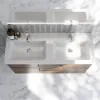 Bei einem Waschtisch aus einem Guss handelt es sich um ein Waschtisch, das direkt in die Arbeitsplatte integriert ist, wodurch ein stilvolles und exklusives Aussehen entsteht. Die meisten Badezimmerwaschtische sind einteilig, aber ein Küchenwaschtisch wird oft in eine Arbeitsplatte eingebaut, was den Unterschied ausmacht, da das einteilige Waschtisch aus einem Stück besteht. Dadurch entsteht eine nahtlose Oberfläche ohne sichtbare Fugen, was sowohl die Ästhetik verbessert als auch die Reinigung erleichtert.