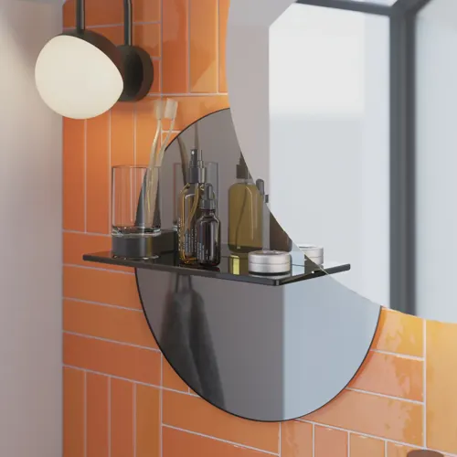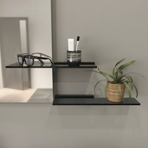 Die Illumi Ablage mit der schwarzen Alukante und den dunkel getönten Glasböden passt perfekt zum asymmetrischen Set, hier gezeigt mit der Illumi Ablage versetzt über die Möbel montiert.