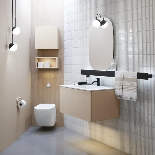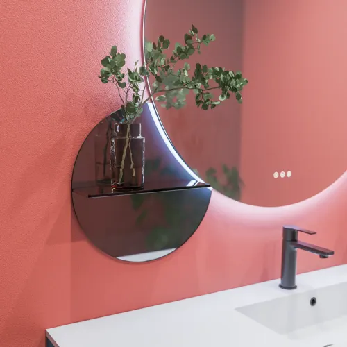 Mit schwebenden Ablagen in der gleichen Farbe wie die Möbel können Sie verschiedene Dekorationen im Badezimmer platzieren und Ihre ganz persönliche Einrichtung gestalten. Die Ablagen sind mit speziellen Aufhängungen versehen wodurch diese einen schwebenden Charakter bekommen. Die Ablagen können z. B. auch neben dem Spiegel aufgehängt werden, um kleine Dinge schnell griffbereit zu haben.