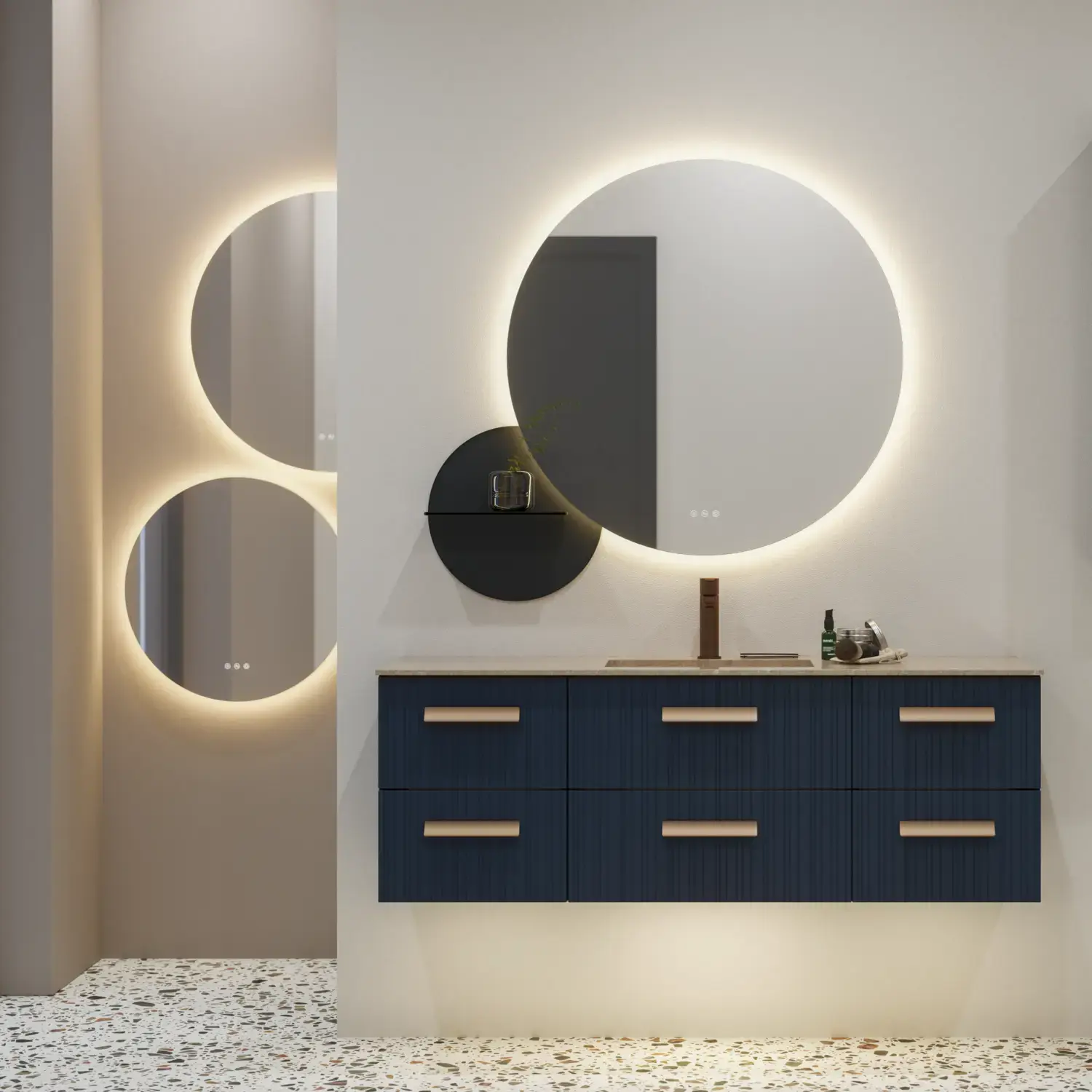Ein runder Spiegel verleiht dem Badezimmer eine weiche und organische Ausstrahlung. Ein runder Spiegel kann eine entspannte und verspielte Atmosphäre schaffen und scharfe Linien und Ecken im Raum auflockern.