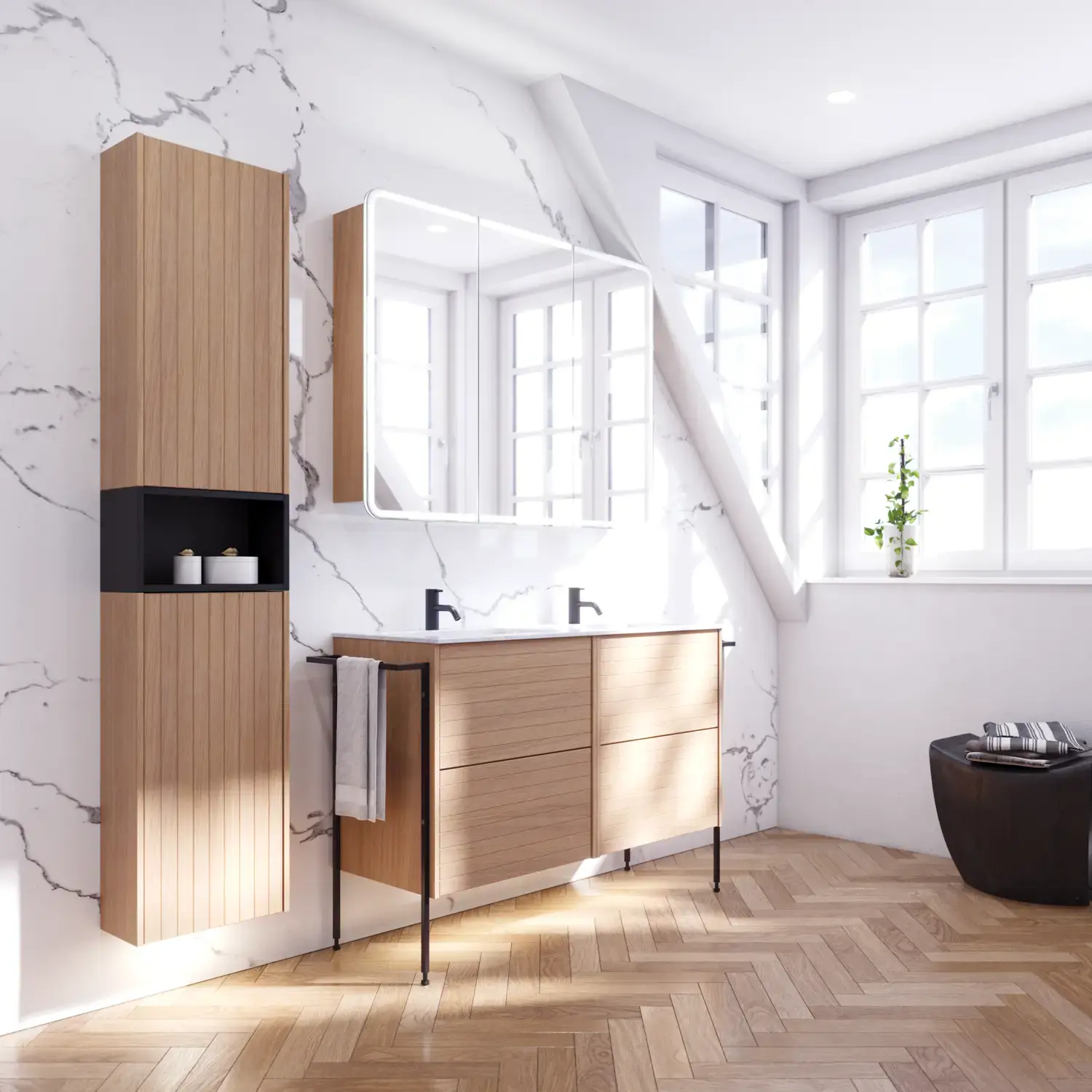Für die platzfordernde Familie, oder wenn Sie einfach nur gern mehr Freiraum haben möchten, ist der doppelte Porzellanwaschtisch eine ideale Lösung für einen Doppelwaschtisch im neuen Badezimmer. Schubladen und Schränke sind in vielen verschiedenen Farben und Oberflächen erhältlich, angefangen von minimalistischen Farbtönen bis zu stimmungsvollen Holzstrukturen. Zu dem haben alle Schubladen platzoptimierte Einsätze sowie eine eingebaute Dämpfung, durch die sich die Schubladen sanft schließen lassen.