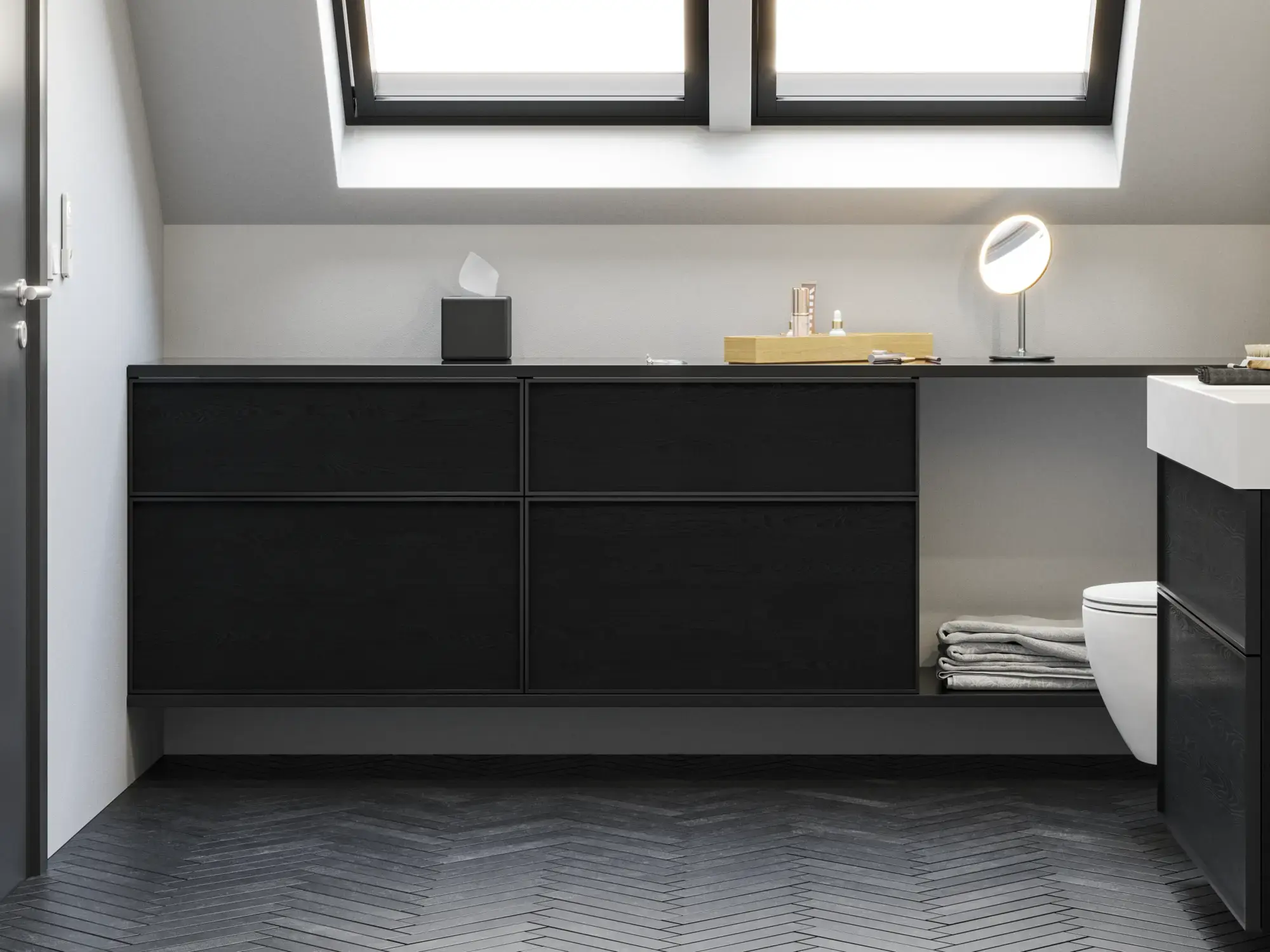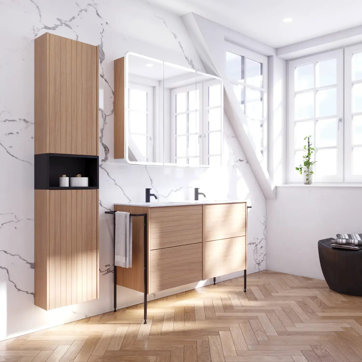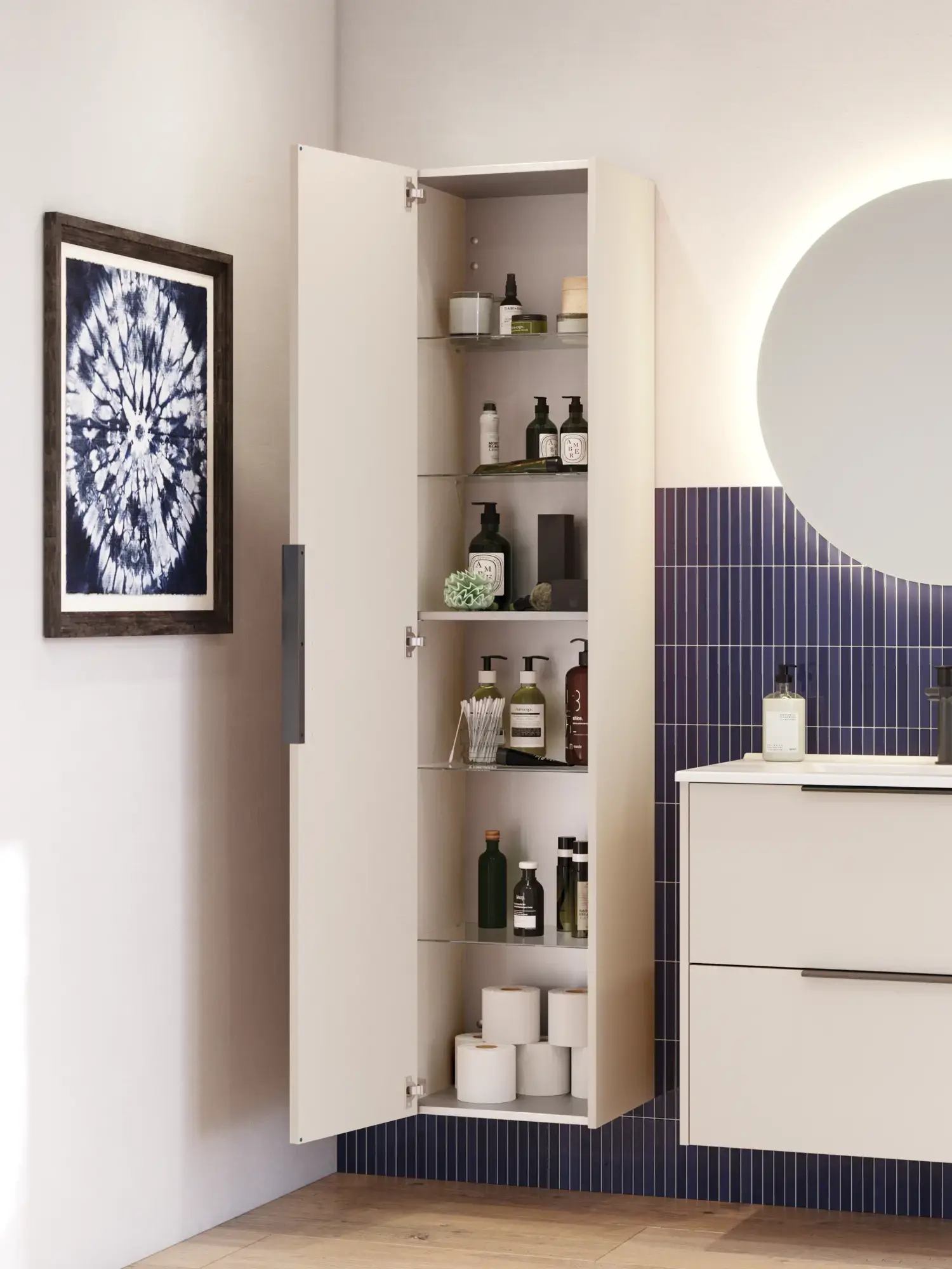 Am Morgen geht alles ein bisschen schneller, wenn die Dinge ihren festen Platz haben und man nicht nach ihnen suchen muss. Es lohnt sich daher, Schubladen und Schränke optimal einzurichten. Wir als Badezimmerspezialisten die, die Herausforderungen unserer Kunden kennen, haben eine Reihe von funktionellem Zubehör wie Raumteiler, versetzbare Holzeinsätze, Innenbeleuchtung für Schubladen und Schränke, Steckdosen in Spiegelschränken und Schubladen für elektrische Geräte, Wäschekörbe für Hochschränke und vieles mehr entwickelt. All dies sind Dinge, die Ihren Alltag im Badezimmer erleichtern.