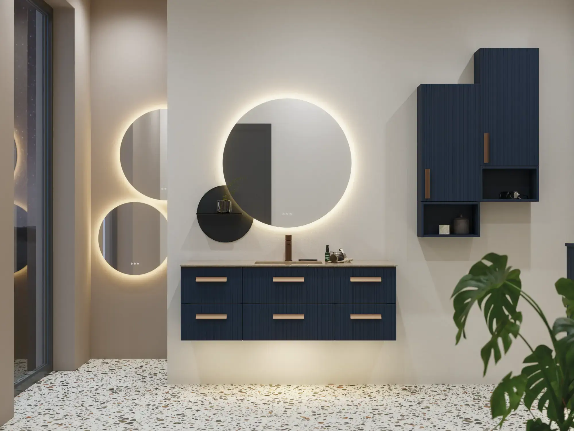 Der Platz vor dem Spiegel ist oft sehr begehrt insbesondere dann, wenn die ganze Familie gleichzeitig einen Termin wahrnehmen will. Für ein großes Badezimmer bieten sich viele Möglichkeiten an, um zusätzlichen Platz für Spiegellösungen zu schaffen.