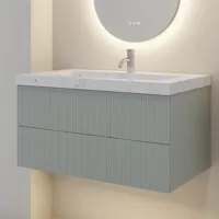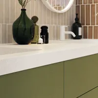 Tischplatten, Waschtischunterschränke, Schubladen, Schubladenfronten, Aufbewahrungsschränke, Schranktüren, Spiegelschränke, Oberschränke, Ablagen, Türen, Hochschränke, Griffe, Stützbeine, Scharniere, Dämpfer und Schubladenschienen.