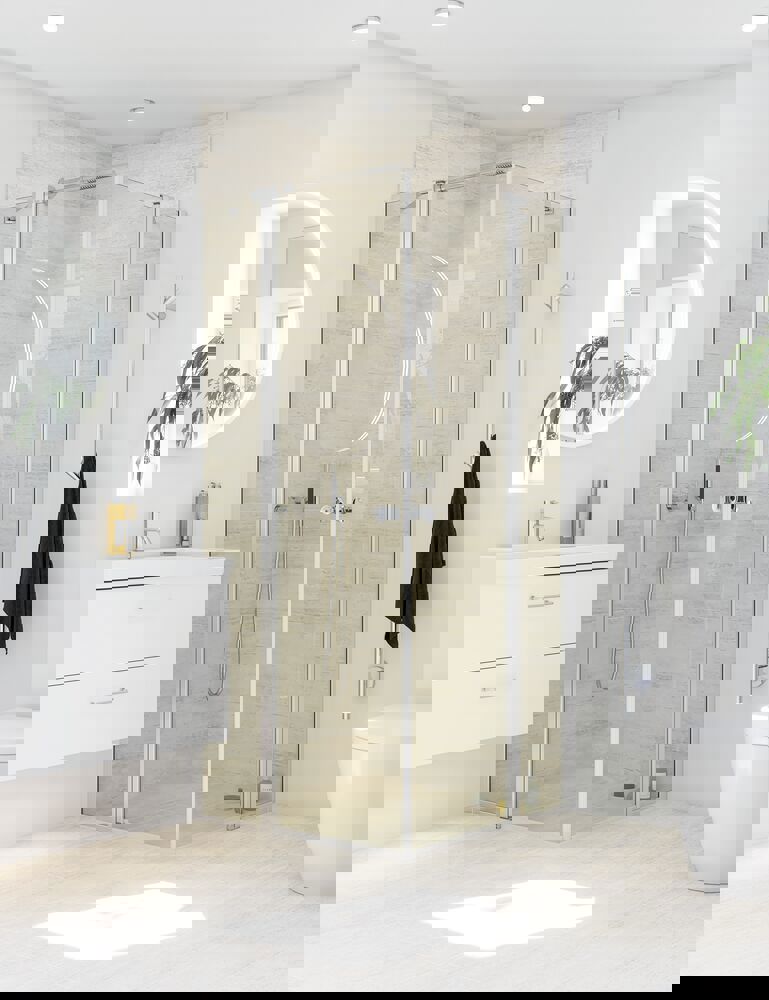 Die Drehtüren mit Festteil bieten eine stabile und elegante Umrandung der Dusche, minimieren die Wasserverschwendung und schaffen ein Gefühl von Privatsphäre. Sie können sich in der Nähe Ihrer Duschecke einrichten, was praktisch ist, wenn Sie wenig Platz haben. Die eingebaute Drehtür lässt sich einklappen, ohne die Armatur zu berühren, wenn Sie die Dusche nicht benutzen, so dass Sie mehr Platz in Ihrem Badezimmer haben. Das Glas ist aus gehärtetem Sicherheitsglas und mit EasyCare behandelt, was eine lange Lebensdauer und Sicherheit gewährleistet. Mit den festen Wänden mit Schwenktür von Dansani erhalten Sie eine elegante und funktionelle Lösung für Ihr Badezimmer.