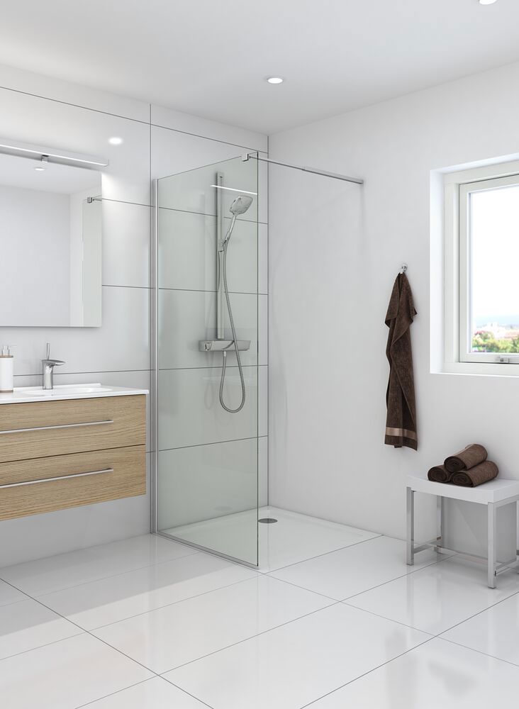 Der feste Duschwand wurde mit dem Ziel entwickelt, einen geräumigen und stilvollen Duschbereich zu schaffen, der vollständig an Ihren persönlichen Stil und Ihr Badezimmerdekor angepasst werden kann. Unsere festen Duschwände können mit anderen Duschabtrennungen aus dem Matzh Programm kombiniert werden und geben Ihnen die Möglichkeit, eine Lösung zu schaffen, die perfekt in Ihr Badezimmer passt. Vielleicht haben Sie viel Platz und können eine begehbare Dusche einrichten? Oder möchten Sie den festen Duschwand mit einer Drehtür kombinieren, um eine stabile und sichere Lösung zu erhalten? Wie auch immer Sie sich entscheiden, Sie können die Lösung finden, die am besten zu Ihnen passt. Das Glas an der festen Duschwand ist mit EasyCare behandelt, einer speziellen Beschichtung, die Wasser und Seifenreste abweist und so die Reinigung erheblich erleichtert. Das Glas ist außerdem gehärtet, und die starke Konstruktion und die soliden Materialien sorgen dafür, dass die Duschwand stabil und zuverlässig ist.