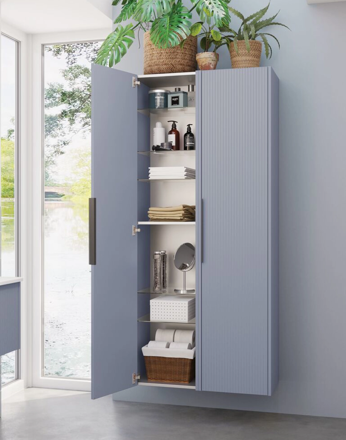 Dieser Hochschrank kombiniert die Flexibilität einer reversibler Tür mit einer eleganten gestreiften Front, die Ihrem Badezimmer einen modernen Touch verleiht. Im Inneren befinden sich eine Holzablage und 4 Glasablagen, die viel Platz für die Organisation Ihrer Toilettenartikel bieten. Der Schrank ist in den Farben Weiß, Sand oder Hellblau erhältlich und dank des integrierten Griffs sofort einsatzbereit.