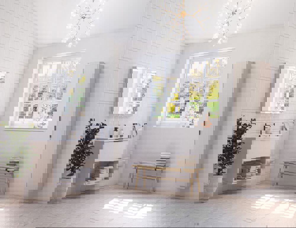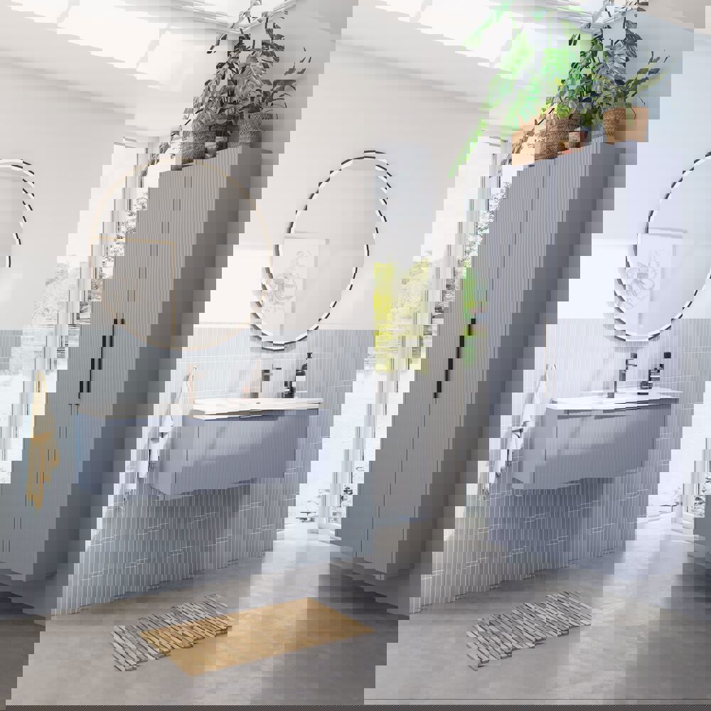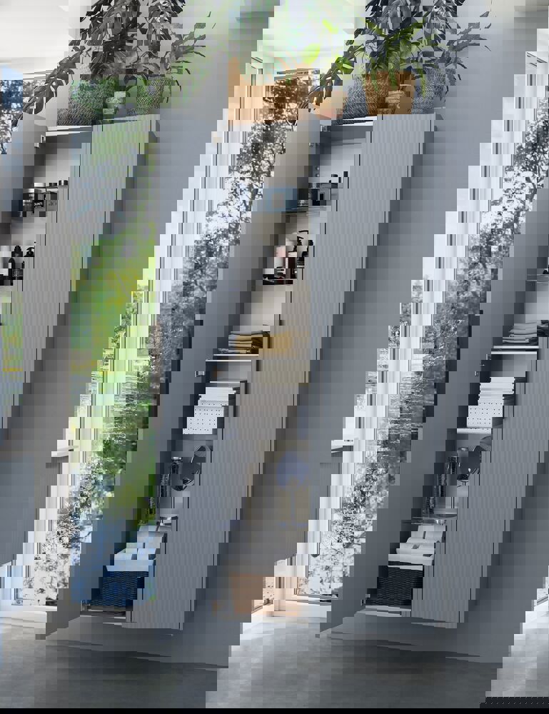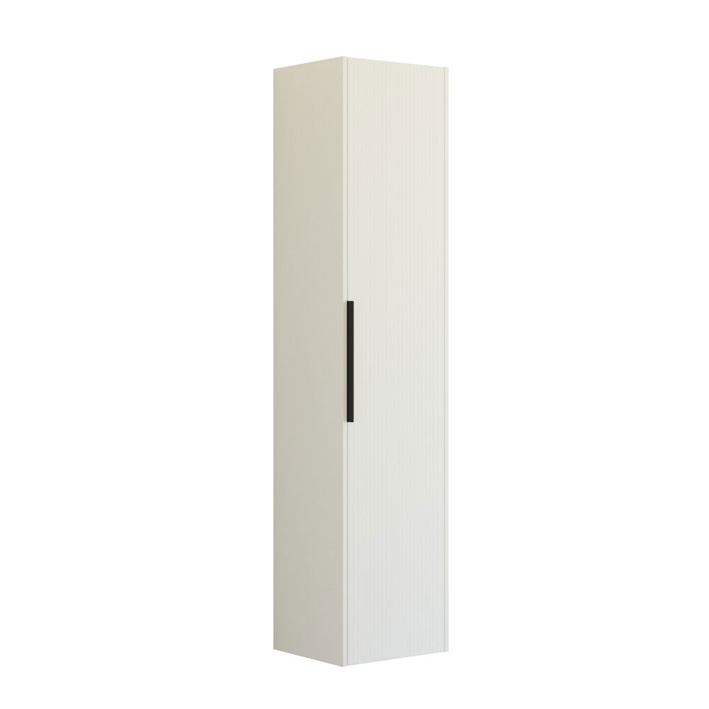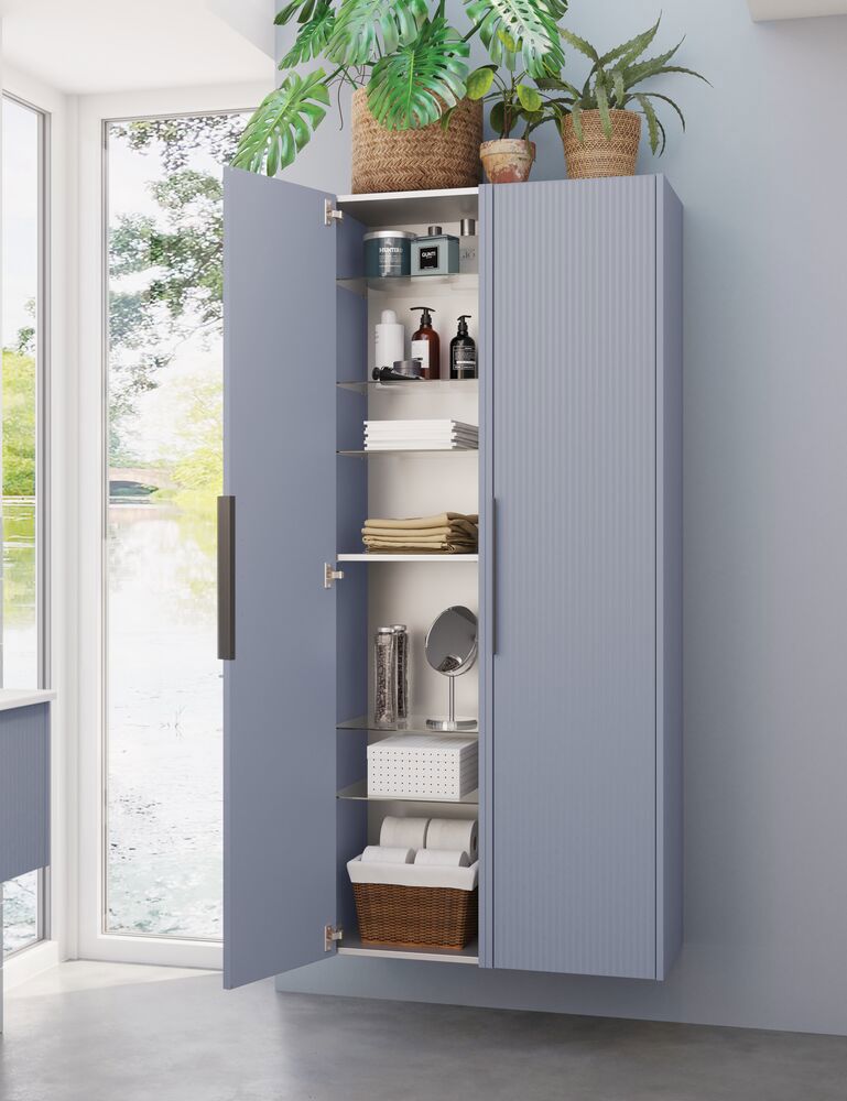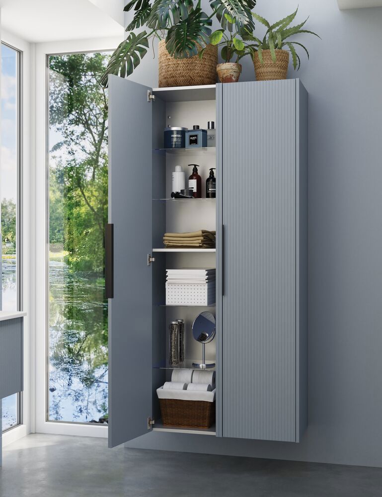 Dieser Hochschrank kombiniert die Flexibilität einer reversibler Tür mit einer eleganten gestreiften Front, die Ihrem Badezimmer einen modernen Touch verleiht. Im Inneren befinden sich eine Holzablage und 4 Glasablagen, die viel Platz für die Organisation Ihrer Toilettenartikel bieten. Der Schrank ist in den Farben Weiß, Sand oder Hellblau erhältlich und dank des integrierten Griffs sofort einsatzbereit.