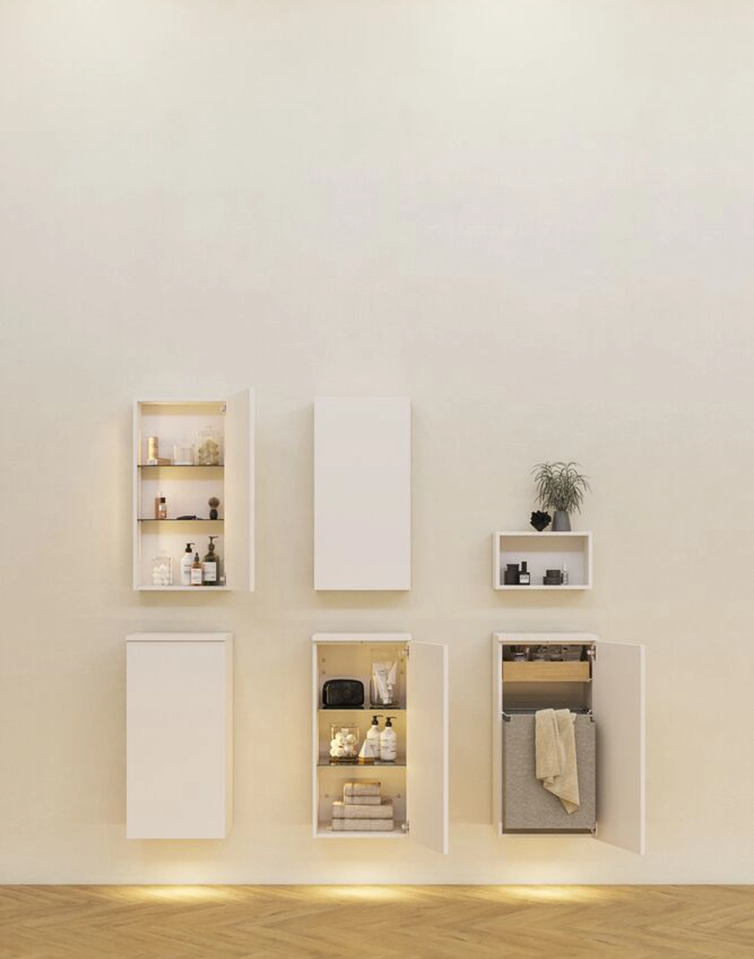 Mit den Hängeschränken schaffen Sie Platz und Ordnung in Ihrem Badezimmer. Erhältlich mit 2 Glasböden, ist dieser elegante Schrank sowohl stilvoll als auch funktional. Verwenden Sie den Schrank als Stauraum in Ihrem Badezimmer, um Ihre Cremes, Deodorants usw. geordnet aufzubewahren. Der Schrank ist in verschiedenen Farben erhältlich, die zum Rest Ihres Badezimmers passen. OBS: Für Produkte mit wahlfreie Farbe fällt eine Aufpreis (BI1) an. Einmalige Berechnung, unabhängig von der Anzahl der Elemente. Überlegen Sie Ihre Badmöbel mit praktischem Zubehör auszustatten, an denen Sie täglich Freude haben werden. Wie z.B. LED-Beleuchtung in den Schubladen, Innenbeleuchtung in den Schränken, eine eingebaute Steckdose und LED-Beleuchtung unter dem Schrank inkl. Bewegungssensor und Lichtsteuerung die Ihren nächtlichen Besuch im Bad führt. Das Zubehör wählen Sie direkt mit Ihren Möbeln aus.
