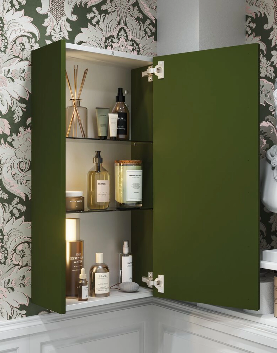 Fügen Sie Ihrem Badezimmer ein zeitloses Element mit einem Oberschrank mit klassischer Rahmenfront hinzu. Mit seinem eleganten Rahmen und den beiden Glaseinlegeböden, die einen klaren Überblick über den Inhalt bieten, ist dieser Schrank perfekt, um Ihre Badezimmerartikel organisiert zu halten. Der Oberschrank misst 40 cm in der Breite und 19 cm in der Tiefe, was ihn ideal für kleinere Räume macht. Kombinieren Sie ihn mit einem offenen Regal, um einen harmonischen Look zu schaffen, in dem Sie sowohl Ihre Lieblingsprodukte als auch Dekorationen aufbewahren und ausstellen können. OBS: Für Produkte mit wahlfreie Farbe fällt eine Aufpreis (BI1) an. Einmalige Berechnung, unabhängig von der Anzahl der Elemente. Überlegen Sie Ihre Badmöbel mit praktischem Zubehör auszustatten, an denen Sie täglich Freude haben werden. Wie z.B. LED-Beleuchtung in den Schubladen, Innenbeleuchtung in den Schränken, eine eingebaute Steckdose und LED-Beleuchtung unter dem Schrank inkl. Bewegungssensor und Lichtsteuerung die Ihren nächtlichen Besuch im Bad führt. Das Zubehör wählen Sie direkt mit Ihren Möbeln aus.