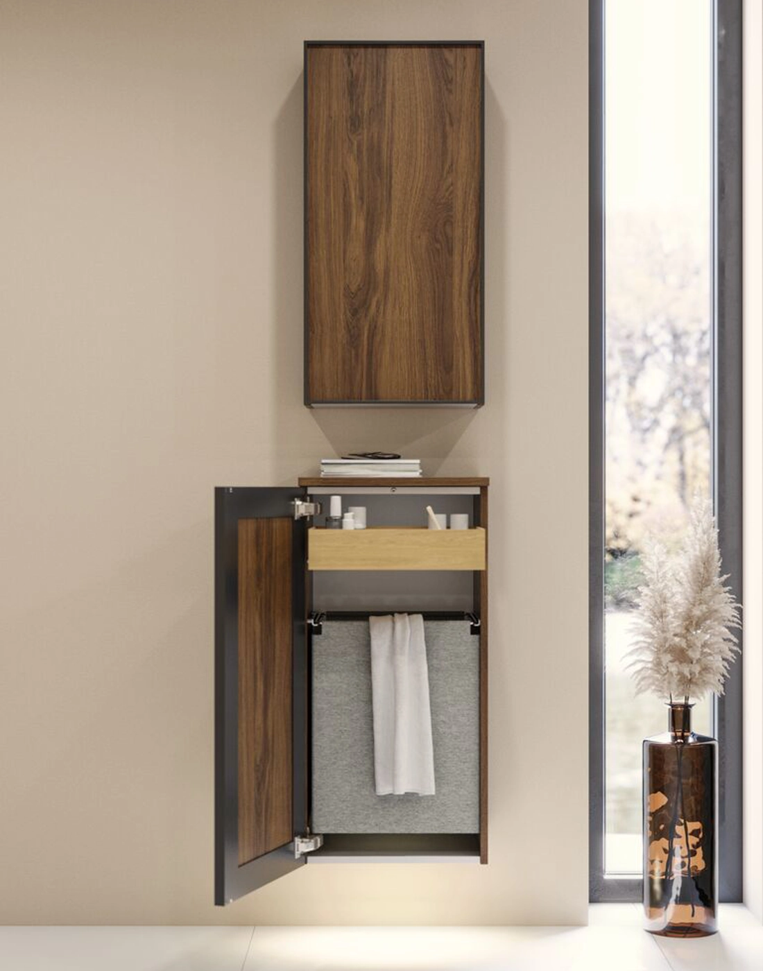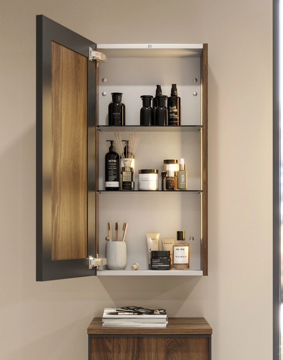 Schaffen Sie zusätzlichen Stauraum mit dem Dansani Oberschrank, der einen schwarzen Rahmen und 2 Glasböden hat und eine moderne, elegante Lösung für Ihr Badezimmer bietet. Der schwarze Rahmen verleiht dem Schrank einen raffinierten Look, der gut in eine moderne Badezimmereinrichtung passt. Verwenden Sie den Oberschrank, um Ordnung in Ihre Cremes, Deos und andere wichtige Produkte zu bringen, sodass Ihr Badezimmer immer ordentlich und stilvoll wirkt. Mit verschiedenen Farboptionen können Sie den Schrank einfach an den Rest Ihres Badezimmers anpassen. OBS: Für Produkte mit wahlfreie Farbe fällt eine Aufpreis (BI1) an. Einmalige Berechnung, unabhängig von der Anzahl der Elemente. Überlegen Sie Ihre Badmöbel mit praktischem Zubehör auszustatten, an denen Sie täglich Freude haben werden. Wie z.B. LED-Beleuchtung in den Schubladen, Innenbeleuchtung in den Schränken, eine eingebaute Steckdose und LED-Beleuchtung unter dem Schrank inkl. Bewegungssensor und Lichtsteuerung die Ihren nächtlichen Besuch im Bad führt. Das Zubehör wählen Sie direkt mit Ihren Möbeln aus.
