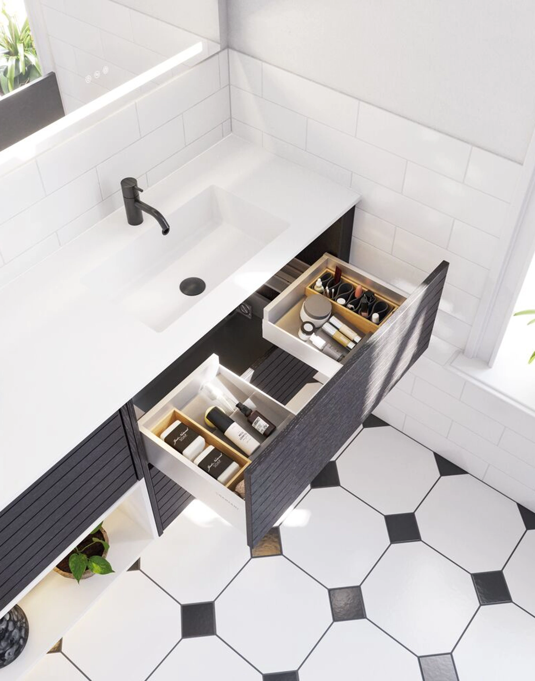 Mit diesem Unterschrank mit Profilfront verleihen Sie Ihrem Badezimmer einen einzigartigen Stil. Die einzelne Schublade ohne Ablauföffnung bietet viel Platz für Ihre Badutensilien, während die Profilfront dem Raum einen charakteristischen und exklusiven Charakter verleiht. Verwenden Sie den Schrank allein mit einer Tischplatte oder kombinieren Sie ihn mit einem Waschtischunterschrank und einem maßgeschneiderten Waschtisch, um ein modernes und asymmetrisches Baddesign zu schaffen. Dieser Unterschrank ist perfekt für alle, die in ihrer Einrichtung sowohl Funktionalität als auch einen einzigartigen Look wünschen. Überlegen Sie Ihre Badmöbel mit praktischem Zubehör auszustatten, an denen Sie täglich Freude haben werden. Wie z.B. LED-Beleuchtung in den Schubladen, Innenbeleuchtung in den Schränken, eine eingebaute Steckdose und LED-Beleuchtung unter dem Schrank inkl. Bewegungssensor und Lichtsteuerung die Ihren nächtlichen Besuch im Bad führt. Das Zubehör wählen Sie direkt mit Ihren Möbeln aus.