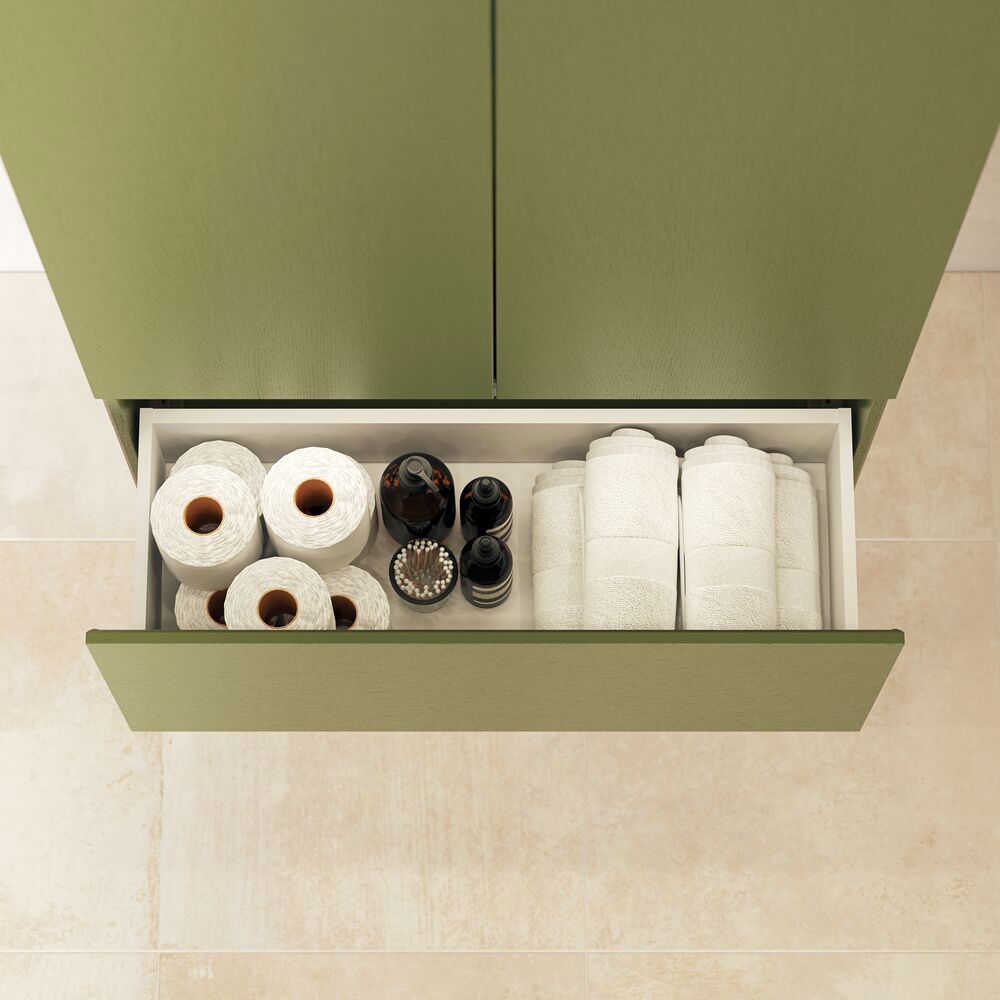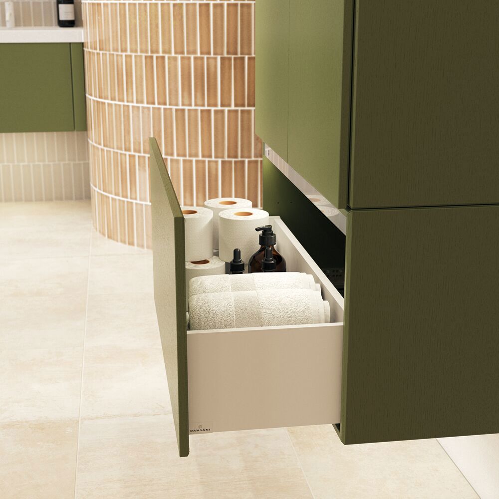 Dansani Calidris Schränke mit 1 Schublade sind die ideale Lösung für eine intelligente und stilvolle Aufbewahrung im Badezimmer. Ohne Platz für Abflüsse sind diese Schränke für diejenigen, die sich für eine asymmetrische Lösung mit einem maßgeschneiderten Waschbecken entscheiden, oder für diejenigen, die zusätzlichen Stauraum an anderer Stelle im Bad wünschen. Die geräumige Schublade sorgt für Ordnung im Bad und bietet viel Platz für Cremes, Shampoo, Haartrockner und vieles mehr. Der Dansani Calidris Schrank gibt Ihnen die Möglichkeit, Ihr Bad auf eine kohärente und schöne Art zu organisieren. OBS: Für Produkte mit Eiche und wahlfreie Farbe fällt eine Aufpreis (BI1) an. Einmalige Berechnung, unabhängig von der Anzahl der Elemente. Überlegen Sie Ihre Badmöbel mit praktischem Zubehör auszustatten, an denen Sie täglich Freude haben werden. Wie z.B. LED-Beleuchtung in den Schubladen, Innenbeleuchtung in den Schränken, eine eingebaute Steckdose und LED-Beleuchtung unter dem Schrank inkl. Bewegungssensor und Lichtsteuerung die Ihren nächtlichen Besuch im Bad führt. Das Zubehör wählen Sie direkt mit Ihren Möbeln aus.