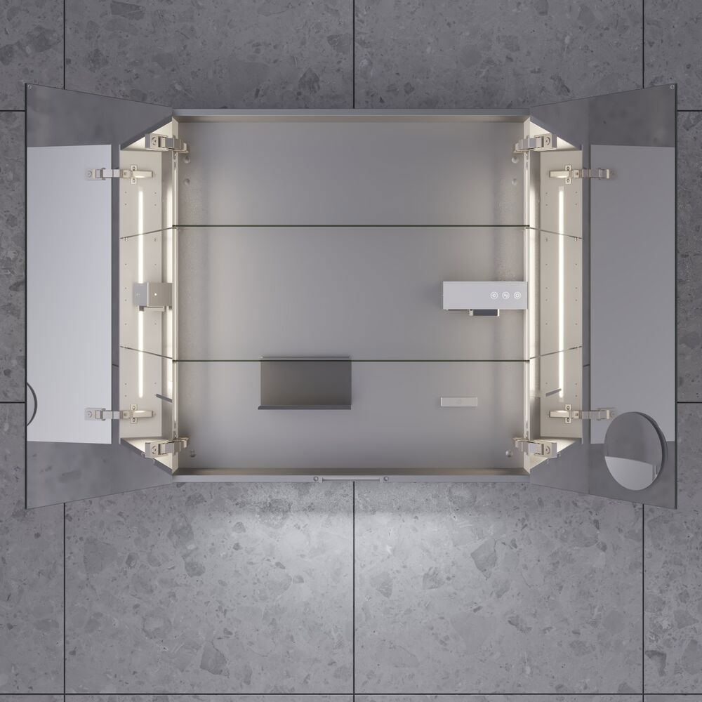 Mit dem Style Spiegelschrank erhalten Sie praktische Aufbewahrung und stilvolles Design. Der Spiegelschrank ist perfekt für die Aufbewahrung all Ihrer Cremes, Deodorants, Nagelscherer, Zahnbürsten und mehr. Fügen Sie dem Spiegelschrank eine Lampe hinzu und steuern Sie die Temperatur und die Stärke des Lichts mit einer einzigen Berührung. Der schöne Spiegelschrank verfügt über eine Magnetleiste, eine Metallablage, einen Vergrößerungsspiegel und eine Steckdose, die Ihre morgendliche und abendliche Routine viel einfacher macht. OBS: Für Produkte mit wahlfreie Farbe fällt eine Aufpreis (BI1) an. Einmalige Berechnung, unabhängig von der Anzahl der Elemente.
