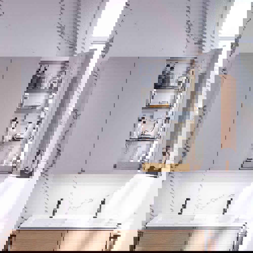 Mit dem Style Spiegelschrank erhalten Sie praktische Aufbewahrung und stilvolles Design. Der Spiegelschrank ist perfekt für die Aufbewahrung all Ihrer Cremes, Deodorants, Nagelscherer, Zahnbürsten und mehr. Fügen Sie dem Spiegelschrank eine Lampe hinzu und steuern Sie die Temperatur und die Stärke des Lichts mit einer einzigen Berührung. Der schöne Spiegelschrank verfügt über eine Magnetleiste, eine Metallablage, einen Vergrößerungsspiegel und eine Steckdose, die Ihre morgendliche und abendliche Routine viel einfacher macht. OBS: Für Produkte mit wahlfreie Farbe fällt eine Aufpreis (BI1) an. Einmalige Berechnung, unabhängig von der Anzahl der Elemente.