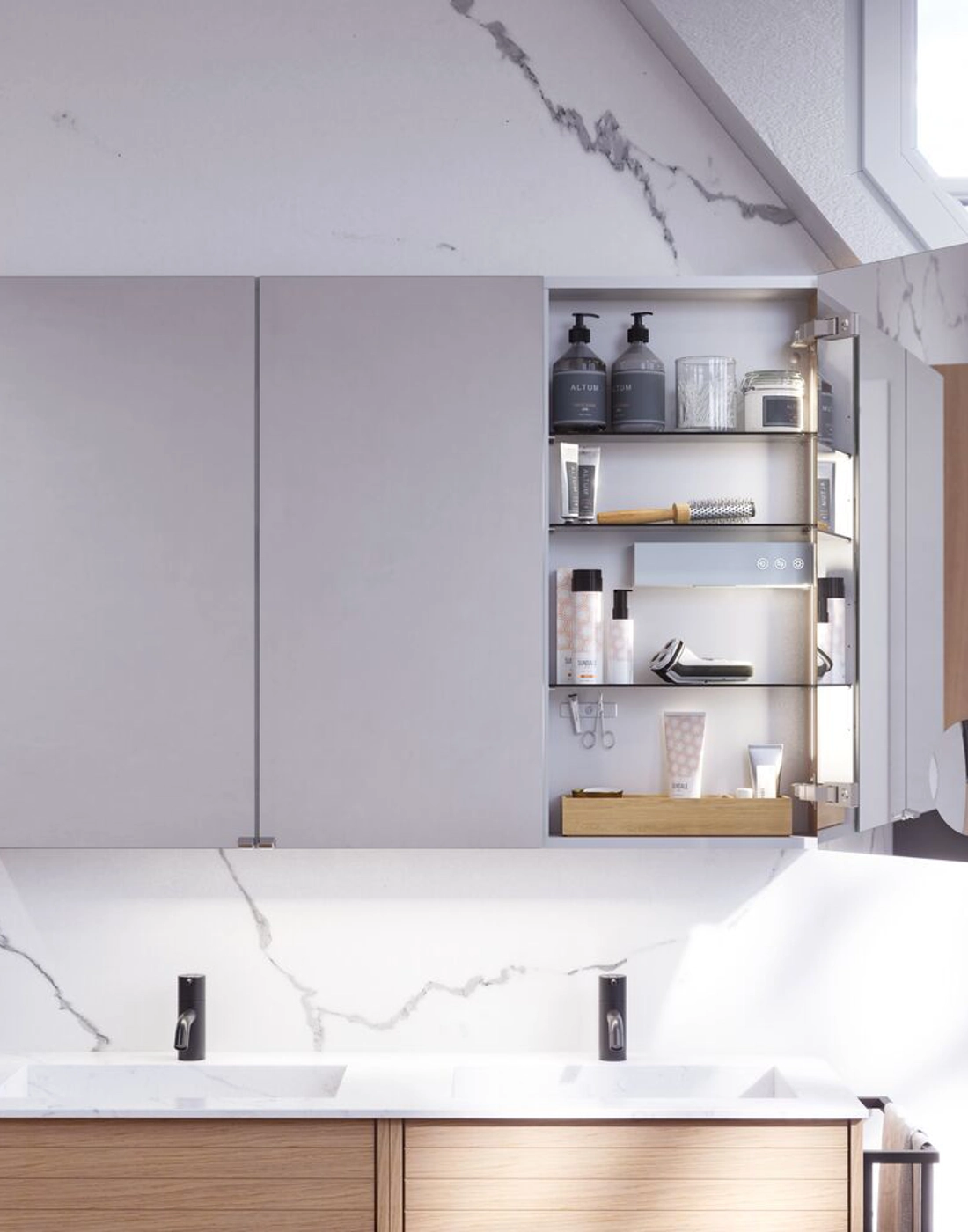 Mit dem Style Spiegelschrank erhalten Sie praktische Aufbewahrung und stilvolles Design. Der Spiegelschrank ist perfekt für die Aufbewahrung all Ihrer Cremes, Deodorants, Nagelscherer, Zahnbürsten und mehr. Fügen Sie dem Spiegelschrank eine Lampe hinzu und steuern Sie die Temperatur und die Stärke des Lichts mit einer einzigen Berührung. Der schöne Spiegelschrank verfügt über eine Magnetleiste, eine Metallablage, einen Vergrößerungsspiegel und eine Steckdose, die Ihre morgendliche und abendliche Routine viel einfacher macht. OBS: Für Produkte mit wahlfreie Farbe fällt eine Aufpreis (BI1) an. Einmalige Berechnung, unabhängig von der Anzahl der Elemente.