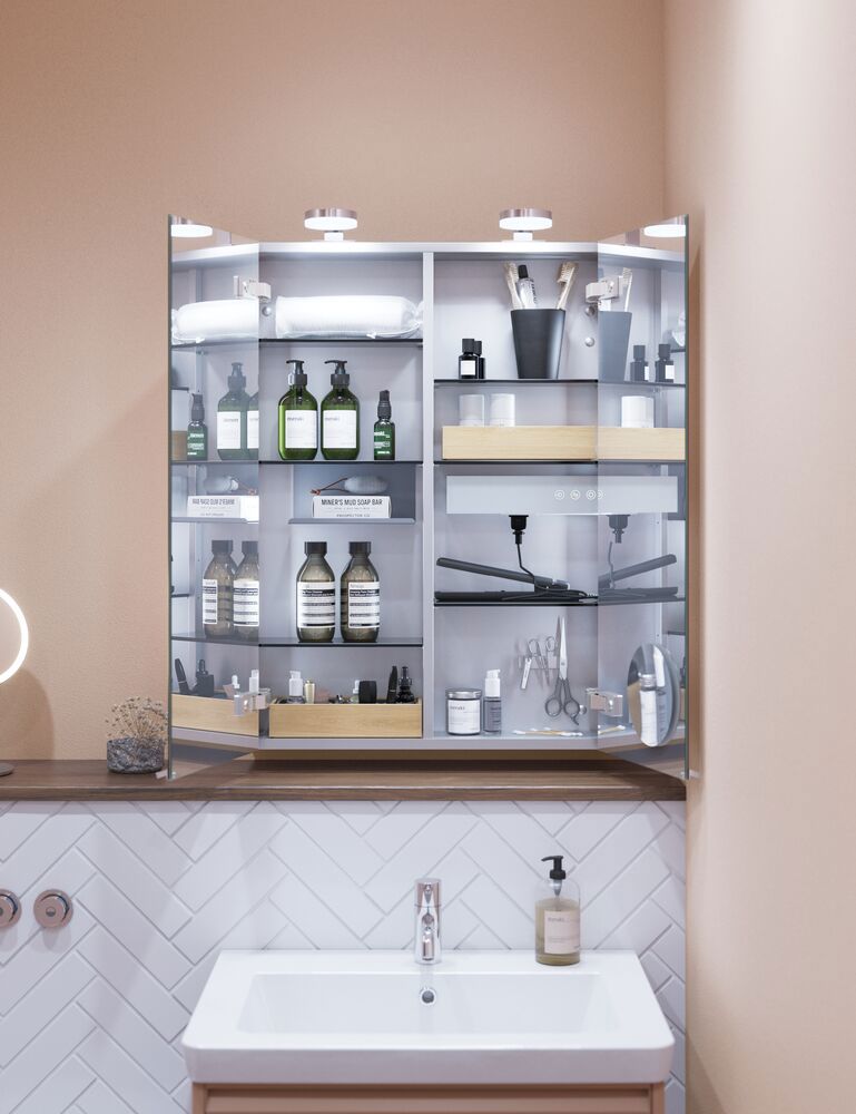 Mit dem Style Spiegelschrank erhalten Sie praktische Aufbewahrung und stilvolles Design. Der Spiegelschrank ist perfekt für die Aufbewahrung all Ihrer Cremes, Deodorants, Nagelscherer, Zahnbürsten und mehr. Fügen Sie dem Spiegelschrank eine Lampe hinzu und steuern Sie die Temperatur und die Stärke des Lichts mit einer einzigen Berührung. Der schöne Spiegelschrank verfügt über eine Magnetleiste, eine Metallablage, einen Vergrößerungsspiegel und eine Steckdose, die Ihre morgendliche und abendliche Routine viel einfacher macht. OBS: Für Produkte mit wahlfreie Farbe fällt eine Aufpreis (BI1) an. Einmalige Berechnung, unabhängig von der Anzahl der Elemente.