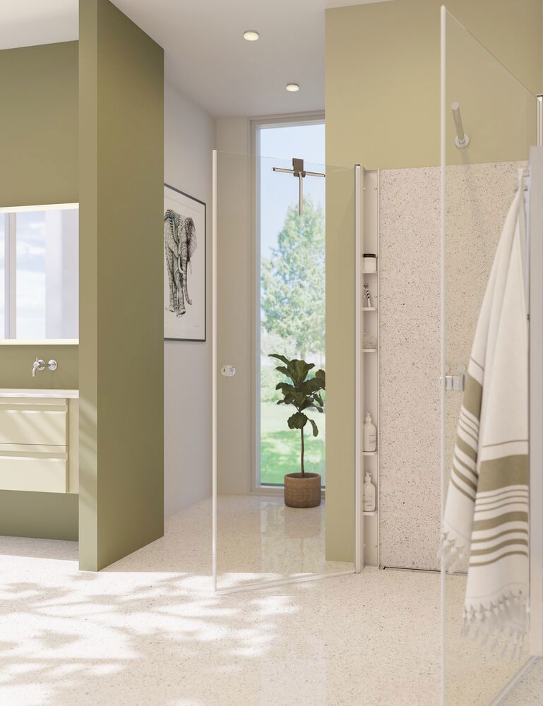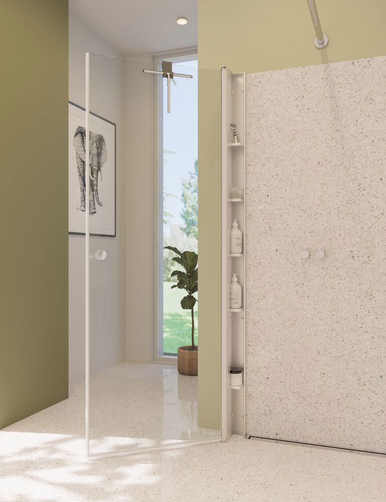 Dansani Tower ist eine innovative Lösung, die außergewöhnlichen Stauraum in der Dusche bietet, ohne Kompromisse bei der Ästhetik einzugehen. Dieses intelligente Aufbewahrungssystem lässt sich nahtlos mit den Match-Türen und -Wänden von Dansani kombinieren, um eine zusammenhängende und stilvolle Duschlösung zu erzeugen. Tower verfügt über 5 herausnehmbare Böden, die sich perfekt für die Organisation der Produkte und Pflegeprodukte eignen, die Sie in Ihrer Dusche verwenden. Um Platz für den Tower zu schaffen, wählen Sie einfach eine 10 cm schmalere Wand oder Tür. Dansani Tower ist die ideale Lösung für alle, die den Platz in ihrer Dusche optimieren möchten, ohne Kompromisse bei Stil und Funktionalität einzugehen. Mit Tower erhalten Sie sowohl praktischen Stauraum als auch ein elegantes Duscherlebnis, das für Wohlbefinden und Ordnung in Ihrem Badezimmer sorgt.