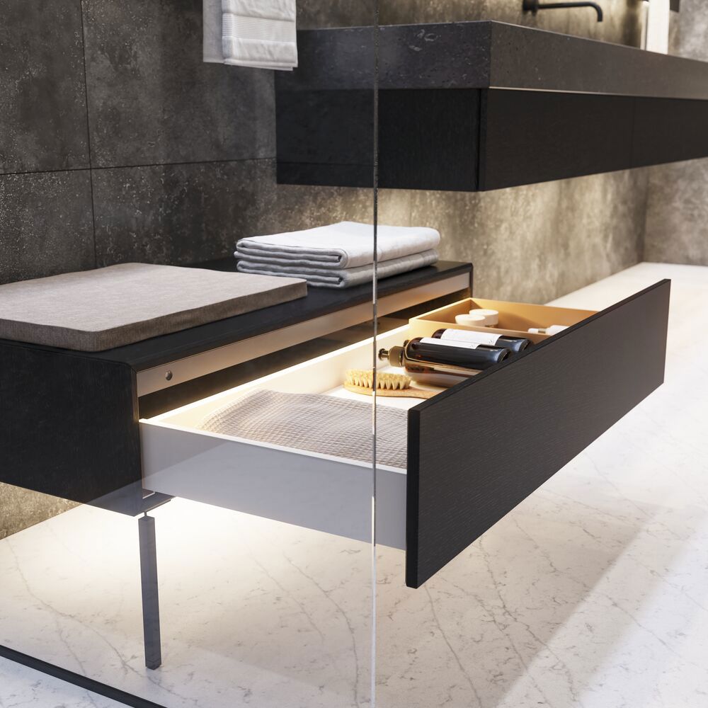Calidris Unique in 12,5 cm Höhe und 50 cm Tiefe wurde geschaffen, um dem Badezimmer Gewicht und Charakter zu verleihen. Die weichen, abgerundeten Linien bilden einen schönen Kontrast zum massiven Profil, und das Silestone®-Material bietet ein Erlebnis von kompromissloser Qualität - schön wie Naturstein, seidig weich im Griff und mit einer Festigkeit, die es resistent gegen Flecken, Kratzer und Feuchtigkeit macht. Mit mindestens 20 % recyceltem Material und einer umweltfreundlichen Produktion ist es eine Wahl, die Luxus und Verantwortung miteinander verbindet. Das Waschbecken wird nach Maß gefertigt, damit es genau in Ihren Raum passt, und Sie können aus der gesamten exklusiven Farbkollektion von Cosentino wählen - von gedämpften, zeitlosen Tönen bis hin zu kräftigen, dramatischen Farben. Das Modell kann in einen Schrank eingebaut werden, um einen klassischen, raffinierten Look zu erzielen, oder an die Wand gehängt werden, um ein leichtes und frei schwebendes Design zu schaffen. Die Wandmontage eröffnet neue Möglichkeiten in der Raumgestaltung und verleiht dem Bad einen exklusiven, anderen Charakter, der es auf einzigartige Weise in Szene setzt.