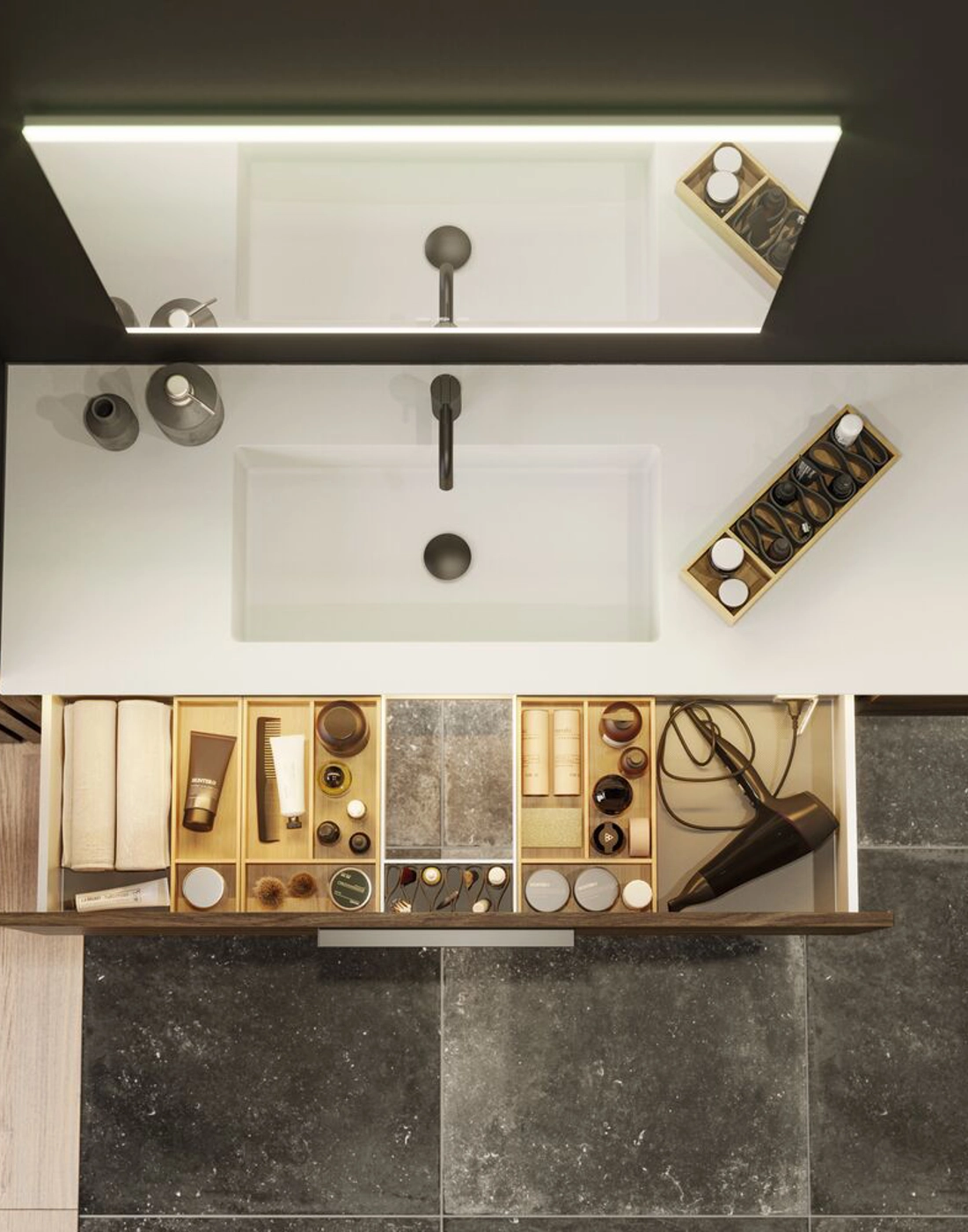 Erweitern Sie Ihr Badezimmer mit Stil und Funktionalität mit einem Waschtischunterschrank. Das elegante Design mit nur einer Schublade bietet Ihnen die perfekte Aufbewahrungslösung für Ihre Badezimmerprodukte. Mit diesem eleganten Schrank, der sich in jede Einrichtung einfügt, schaffen Sie Ordnung in Ihrem Bad. Der Waschtisch ist in verschiedenen Farben erhältlich, sodass Sie diejenige wählen können, die am besten zu Ihrem Stil passt. OBS: Für Produkte mit wahlfreie Farbe fällt eine Aufpreis (BI1) an. Einmalige Berechnung, unabhängig von der Anzahl der Elemente. Überlegen Sie Ihre Badmöbel mit praktischem Zubehör auszustatten, an denen Sie täglich Freude haben werden. Wie z.B. LED-Beleuchtung in den Schubladen, Innenbeleuchtung in den Schränken, eine eingebaute Steckdose und LED-Beleuchtung unter dem Schrank inkl. Bewegungssensor und Lichtsteuerung die Ihren nächtlichen Besuch im Bad führt. Das Zubehör wählen Sie direkt mit Ihren Möbeln aus.