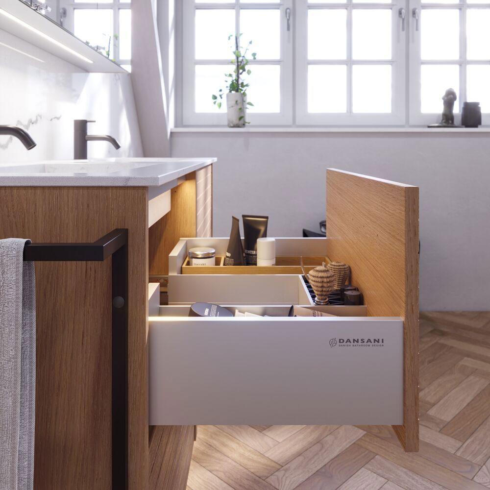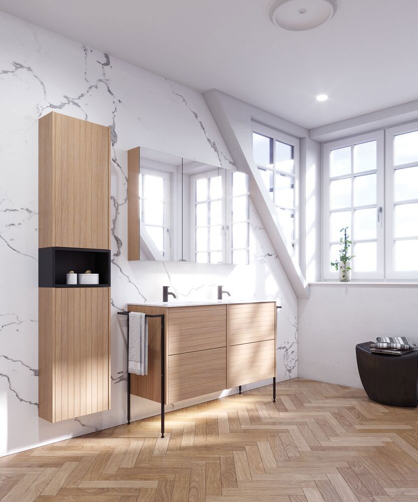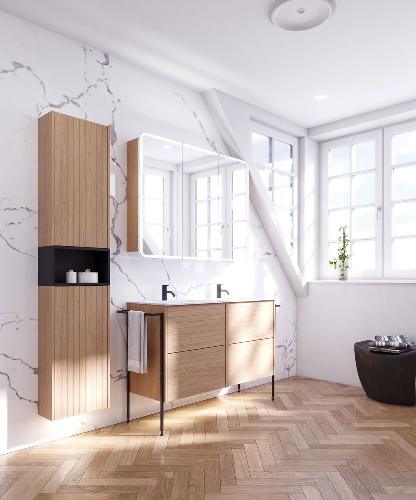 Setzen Sie ein einzigartiges Stil-Statement in Ihrem Badezimmer mit dem Waschtischunterschrank mit Profilfront. Die beiden Schubladen, jeweils 32 cm hoch, bieten optimalen Stauraum, um Ihre Badezimmerartikel ordentlich aufzubewahren. Die Profilfront schafft eine charakterstarke und moderne Optik, die auffällt und Ihrem Raum Persönlichkeit verleiht. Dieser Schrank vereint Funktionalität mit Ästhetik und ist die ideale Wahl für alle, die ihr Badezimmer sowohl praktisch als auch stilvoll gestalten möchten. Überlegen Sie Ihre Badmöbel mit praktischem Zubehör auszustatten, an denen Sie täglich Freude haben werden. Wie z.B. LED-Beleuchtung in den Schubladen, Innenbeleuchtung in den Schränken, eine eingebaute Steckdose und LED-Beleuchtung unter dem Schrank inkl. Bewegungssensor und Lichtsteuerung die Ihren nächtlichen Besuch im Bad führt. Das Zubehör wählen Sie direkt mit Ihren Möbeln aus.