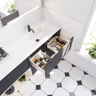 Setzen Sie ein einzigartiges Stil-Statement in Ihrem Badezimmer mit dem Waschtischunterschrank mit Profilfront. Die beiden Schubladen, jeweils 32 cm hoch, bieten optimalen Stauraum, um Ihre Badezimmerartikel ordentlich aufzubewahren. Die Profilfront schafft eine charakterstarke und moderne Optik, die auffällt und Ihrem Raum Persönlichkeit verleiht. Dieser Schrank vereint Funktionalität mit Ästhetik und ist die ideale Wahl für alle, die ihr Badezimmer sowohl praktisch als auch stilvoll gestalten möchten. Überlegen Sie Ihre Badmöbel mit praktischem Zubehör auszustatten, an denen Sie täglich Freude haben werden. Wie z.B. LED-Beleuchtung in den Schubladen, Innenbeleuchtung in den Schränken, eine eingebaute Steckdose und LED-Beleuchtung unter dem Schrank inkl. Bewegungssensor und Lichtsteuerung die Ihren nächtlichen Besuch im Bad führt. Das Zubehör wählen Sie direkt mit Ihren Möbeln aus.