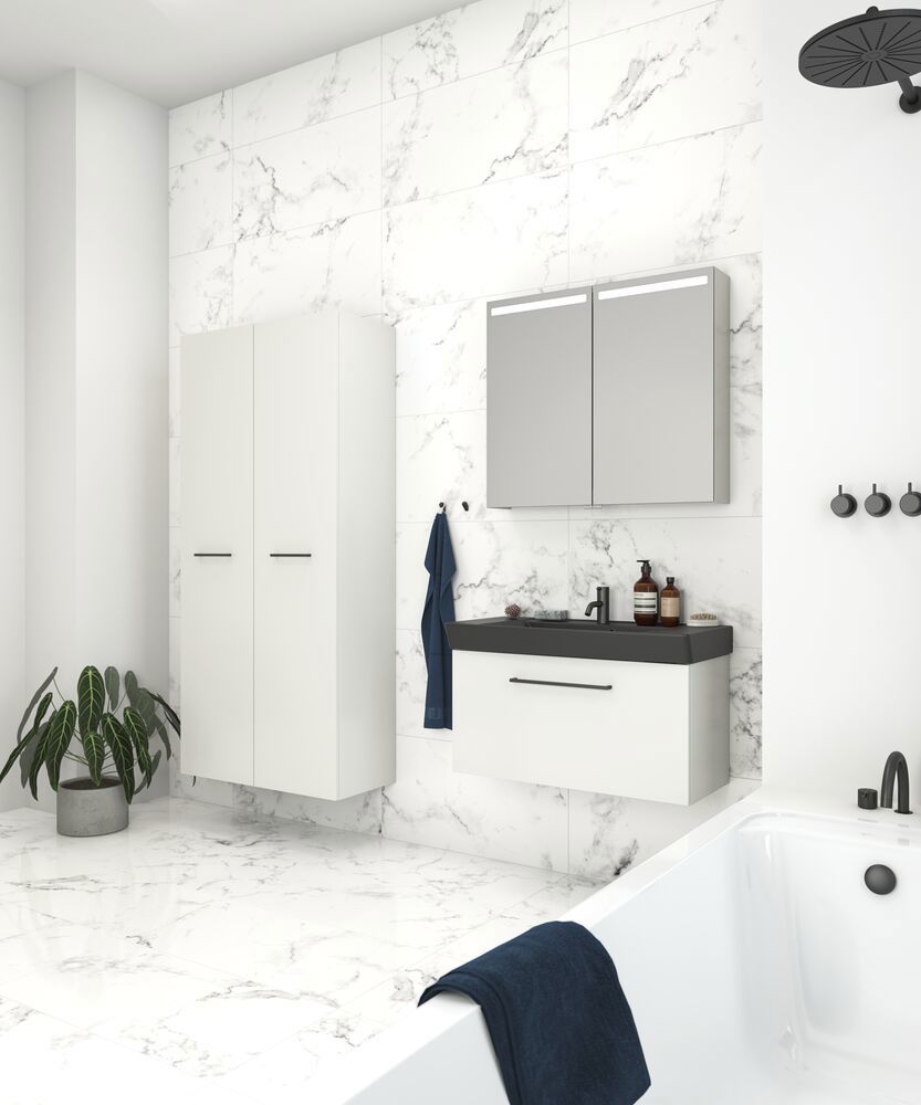 Dieser geräumige Waschtischunterschrank verbindet Ästhetik und Funktion auf das Schönste. Die zwei großen Schubladen bieten viel Platz und eine gute Übersicht und schließen elegant mit Soft-Close und hochwertigen Gleitern. Die gestreifte, matte weiße Oberfläche verleiht dem Möbel eine subtile Textur, die ihm Persönlichkeit und Leichtigkeit verleiht, während der schwarze Griff den modernen Look vervollständigt. Ein Badmöbel, das sowohl praktisch als auch schön anzusehen ist.