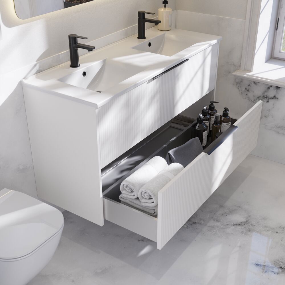 Dieser Waschtischunterschrank kombiniert Funktionalität und Stil mit seinen 2 geräumigen Schubladen und einer eleganten gestreiften Front. Erhältlich in Weiß, Sand oder Hellblau, wird dieser Schrank Ihrem Badezimmer einen modernen und einzigartigen Look verleihen. Die Schubladen bieten viel Stauraum und die Griffe sind montiert und einsatzbereit.