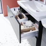 Hinter den Türen verbirgt sich ausreichend Regalfläche für Handtücher und hohe Reinigungsmittelflaschen. Mit den hohen Waschtischunterschränken und Schubladen erhalten Sie viel Stauraum und vollen Auszug, damit auch die hinten liegenden Gegenstände gut zu erreichen sind. Türen und Schubladen schließen gedämpft mit einer Soft-Close-Funktion und lassen sich je nach Bedarf einstellen.
