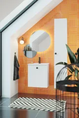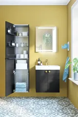 Hinter den Türen verbirgt sich ausreichend Regalfläche für Handtücher und hohe Reinigungsmittelflaschen. Mit den hohen Waschtischunterschränken und Schubladen erhalten Sie viel Stauraum und vollen Auszug, damit auch die hinten liegenden Gegenstände gut zu erreichen sind. Türen und Schubladen schließen gedämpft mit einer Soft-Close-Funktion und lassen sich je nach Bedarf einstellen.